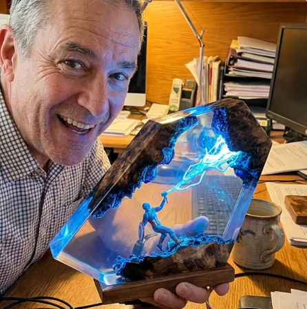 After curing, I sand and polish the surface until it’s smooth and crystal clear. Then I install the lighting so the piece glows evenly and highlights the design.