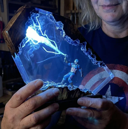 Each lamp is crafted from high-grade, crystal-clear epoxy resin, carefully poured and polished to achieve a glass-like finish that enhances depth and clarity. Inside, every miniature scene is individually hand-painted with fine detail, suspended within the resin for a dimensional effect. The base is made from real hardwood, shaped and finished by hand, then fitted with an integrated LED system to evenly illuminate the piece without generating heat.
